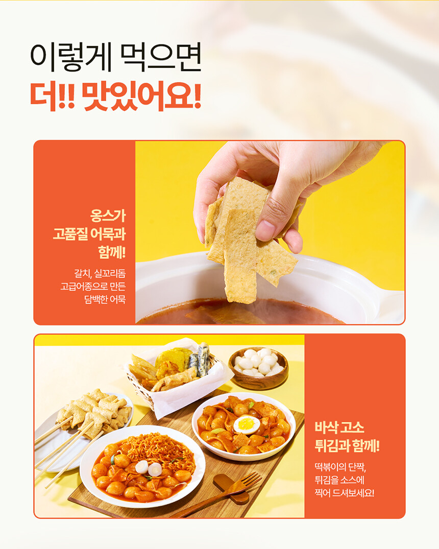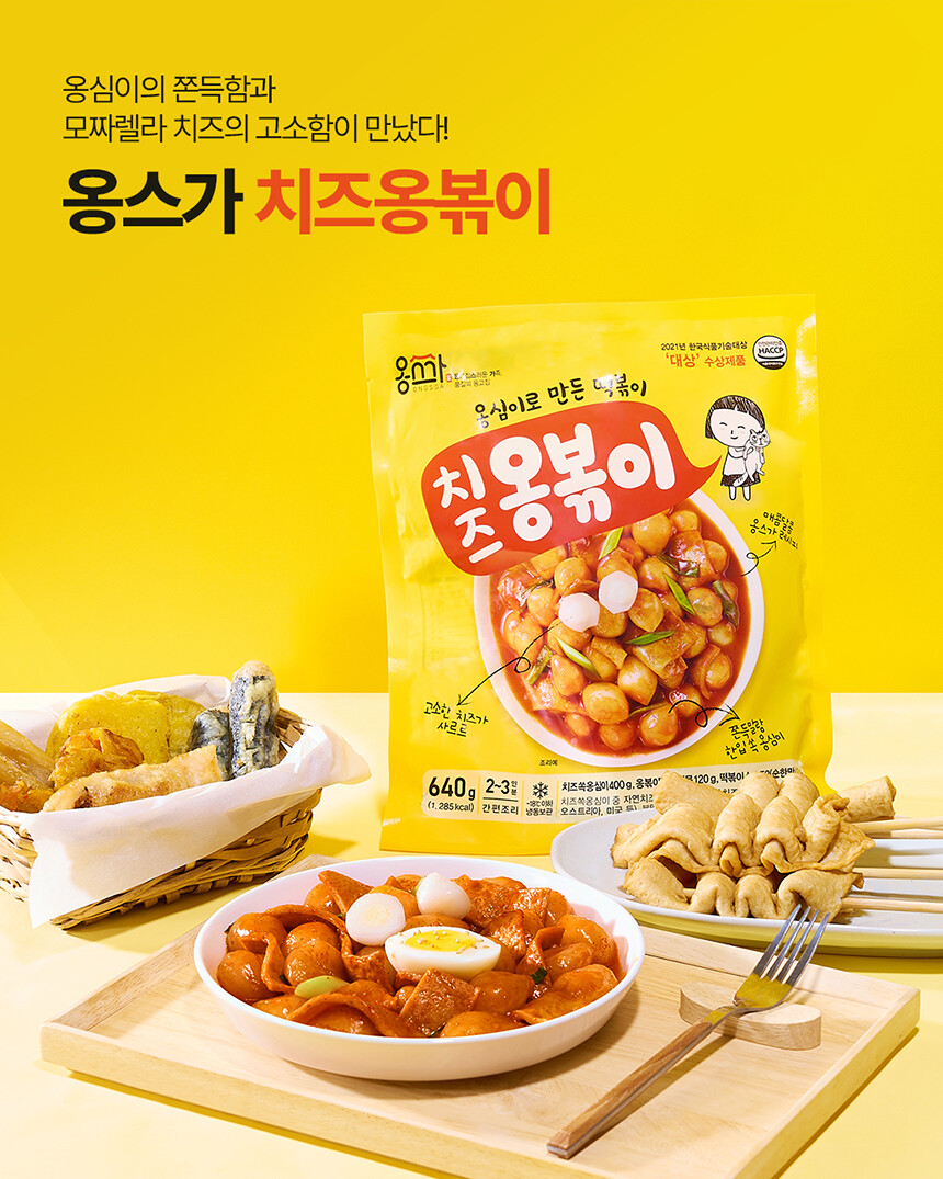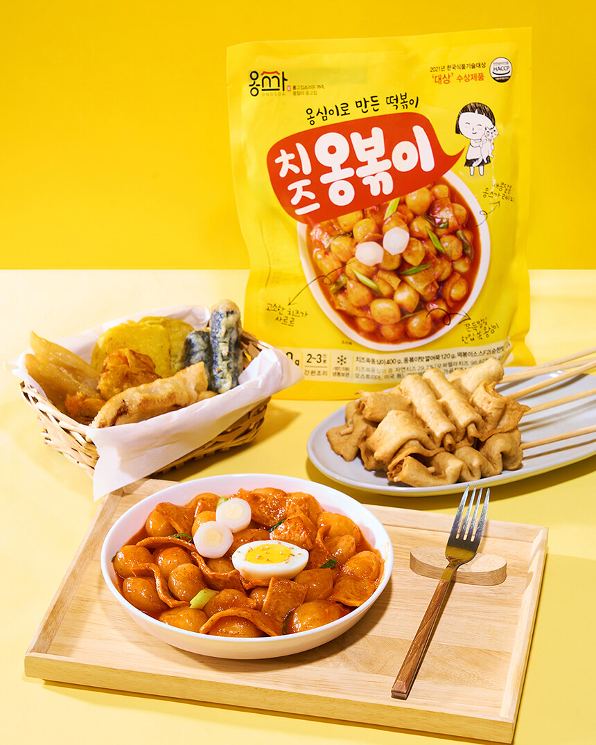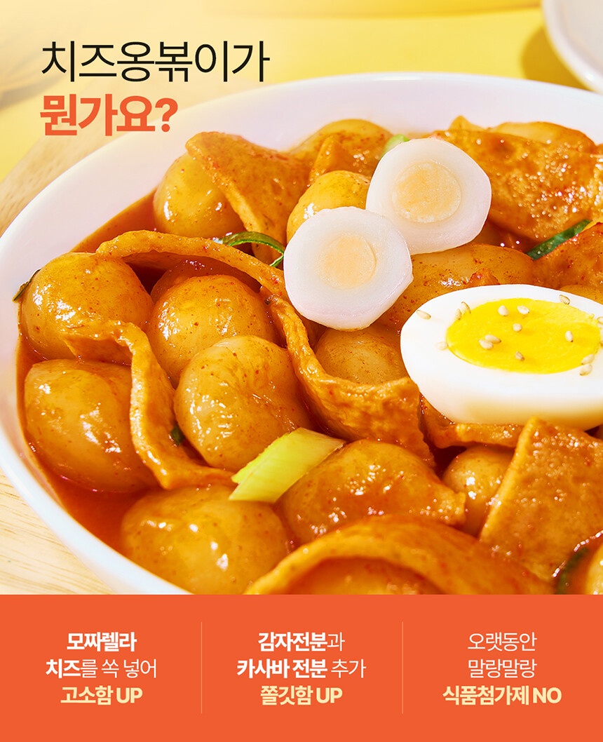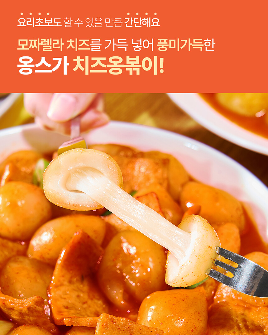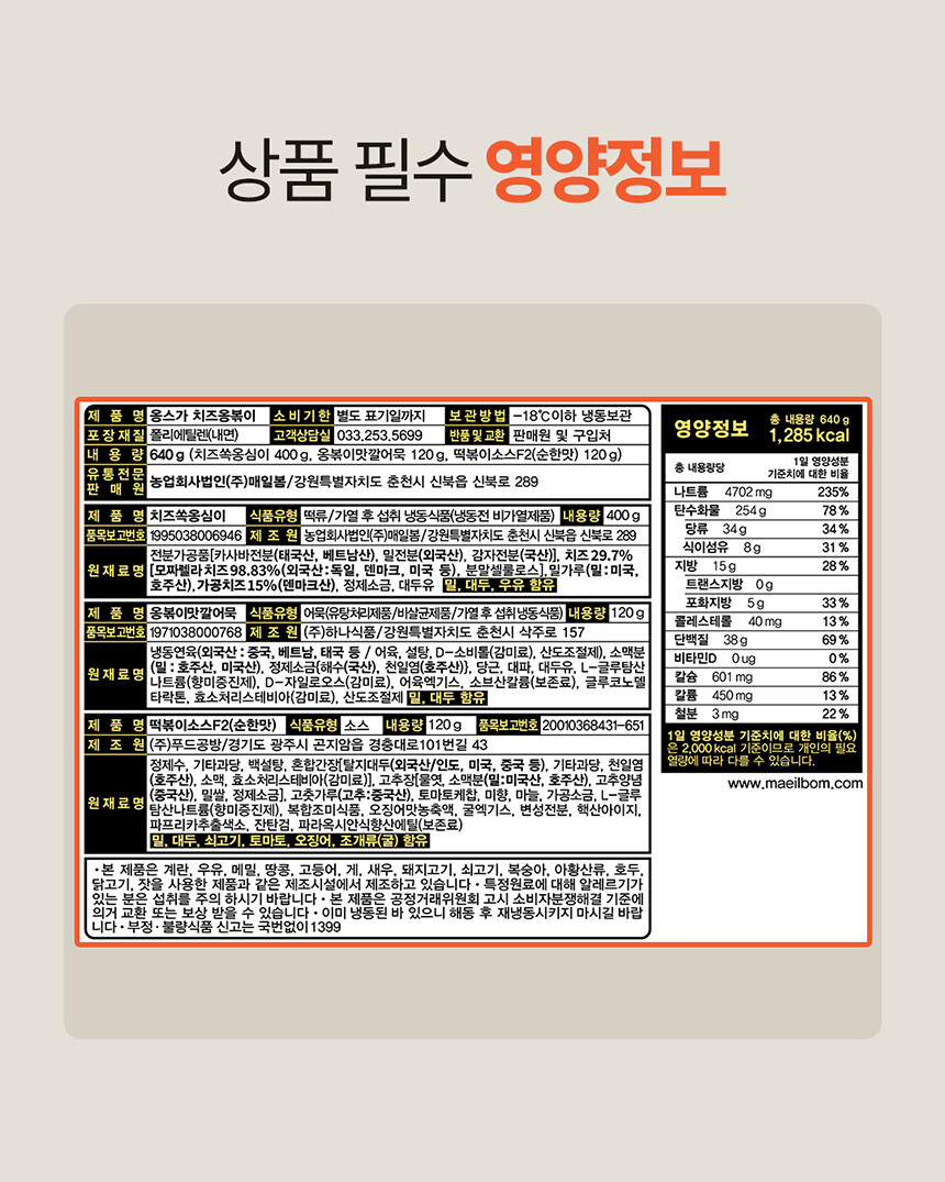치즈쏙옹심이 : 전분가공품[카사바전분(태국산, 베트남산), 밀전분(외국산), 감자전분(국산)], 치즈29.7%[모짜렐라치즈98.83%(외국산:독일, 덴마크, 미국 등), 분말셀룰로스], 밀가루(밀:미국, 호주산), 가공치즈1.5%(덴마크산), 정제소금, 대두유 * 밀, 대두, 우유 함유 / 옹볶이맛깔어묵 : 냉동연육(외국산:중국, 베트남, 태국 등 / 어육, 설탕, D-소비톨(감미료), 산도조절제), 소맥분(밀:호주산, 미국산), 정제소금{해수(국산), 천일염(호주산)}, 당근, 대파, 대두유, L-글루탐산나트륨(향미증진제), D-자일로오스(감미료), 어육엑기스, 소브산칼륨(보존료), 글루코노델타락톤, 효소처리스테비아(감미료), 산도조절제 *밀, 대두 함유 / 떡볶이소스F2(순한맛) : 정제수, 기타과당, 백설탕, 혼합간장[탈지대두(외국산/인도, 미국, 중국 등), 기타과당, 천일염(호주산), 소맥, 효소처리스테비아(감미료)], 고추장[물엿, 소맥분(밀:미국, 호주산), 고추양념(중국산), 밀쌀, 정제소금], 고춧가루(고추:중국산), 토마토케찹, 미향, 마늘, 가공소금, L-글루탐산나트륨(향미증진제), 복합조미식품, 오징어맛농축액, 굴엑기스, 변성전분, 핵산아이지, 파프리카추출색소, 잔탄검, 파라옥시안식향산에틸(보존료) *밀, 대두, 쇠고기, 토마토, 오징어, 조개류(굴) 함유 |