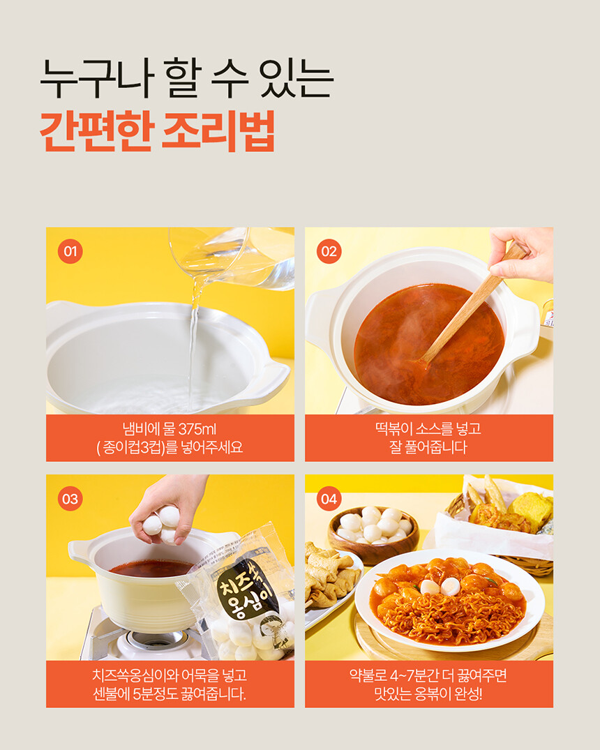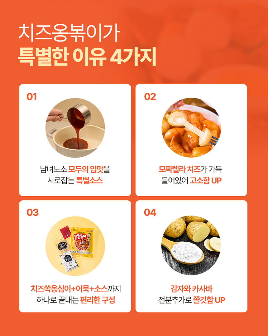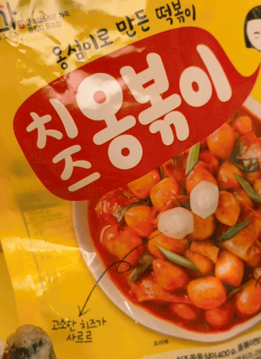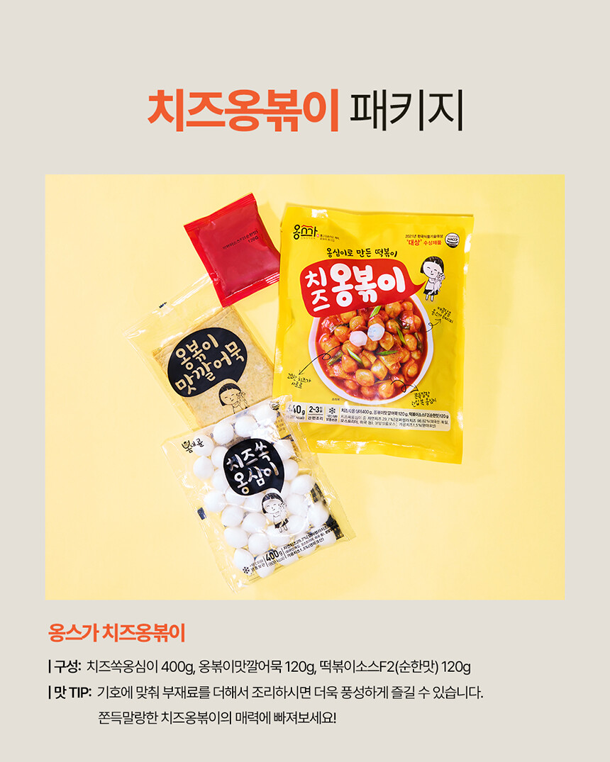치즈쏙옹심이 : 전분가공품[카사바전분(태국산, 베트남산), 밀전분(외국산), 감자전분(국산)], 치즈29.7%[모짜렐라치즈98.83%(외국산:독일, 덴마크, 미국 등), 분말셀룰로스], 밀가루(밀:미국, 호주산), 가공치즈1.5%(덴마크산), 정제소금, 대두유 * 밀, 대두, 우유 함유 / 옹볶이맛깔어묵 : 냉동연육(외국산:중국, 베트남, 태국 등 / 어육, 설탕, D-소비톨(감미료), 산도조절제), 소맥분(밀:호주산, 미국산), 정제소금{해수(국산), 천일염(호주산)}, 당근, 대파, 대두유, L-글루탐산나트륨(향미증진제), D-자일로오스(감미료), 어육엑기스, 소브산칼륨(보존료), 글루코노델타락톤, 효소처리스테비아(감미료), 산도조절제 *밀, 대두 함유 / 떡볶이소스F2(순한맛) : 정제수, 기타과당, 백설탕, 혼합간장[탈지대두(외국산/인도, 미국, 중국 등), 기타과당, 천일염(호주산), 소맥, 효소처리스테비아(감미료)], 고추장[물엿, 소맥분(밀:미국, 호주산), 고추양념(중국산), 밀쌀, 정제소금], 고춧가루(고추:중국산), 토마토케찹, 미향, 마늘, 가공소금, L-글루탐산나트륨(향미증진제), 복합조미식품, 오징어맛농축액, 굴엑기스, 변성전분, 핵산아이지, 파프리카추출색소, 잔탄검, 파라옥시안식향산에틸(보존료) *밀, 대두, 쇠고기, 토마토, 오징어, 조개류(굴) 함유 |
